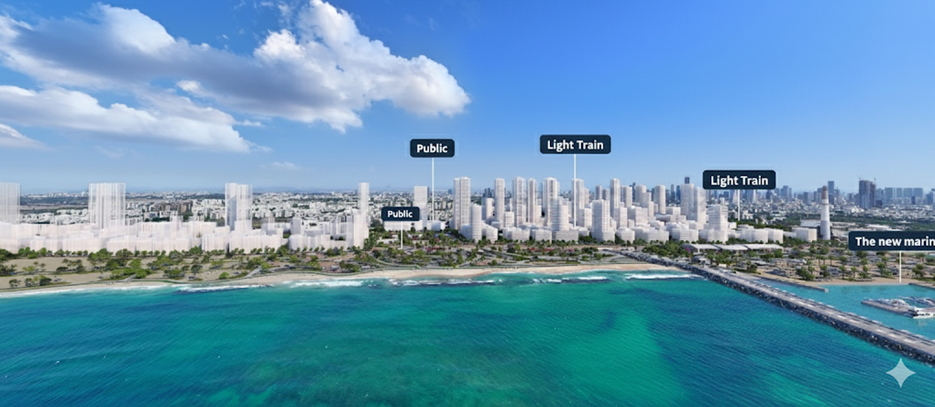 The proposed construction combines low-rise dense building with high-rise towers while maintaining the central function of the street as the plan’s heart, alongside a coastal park which begins at the Tel Baruch beach and ends at the Reading Marina. The Marina is planned to grow and acts as an important addition to the field of sailing in the country.