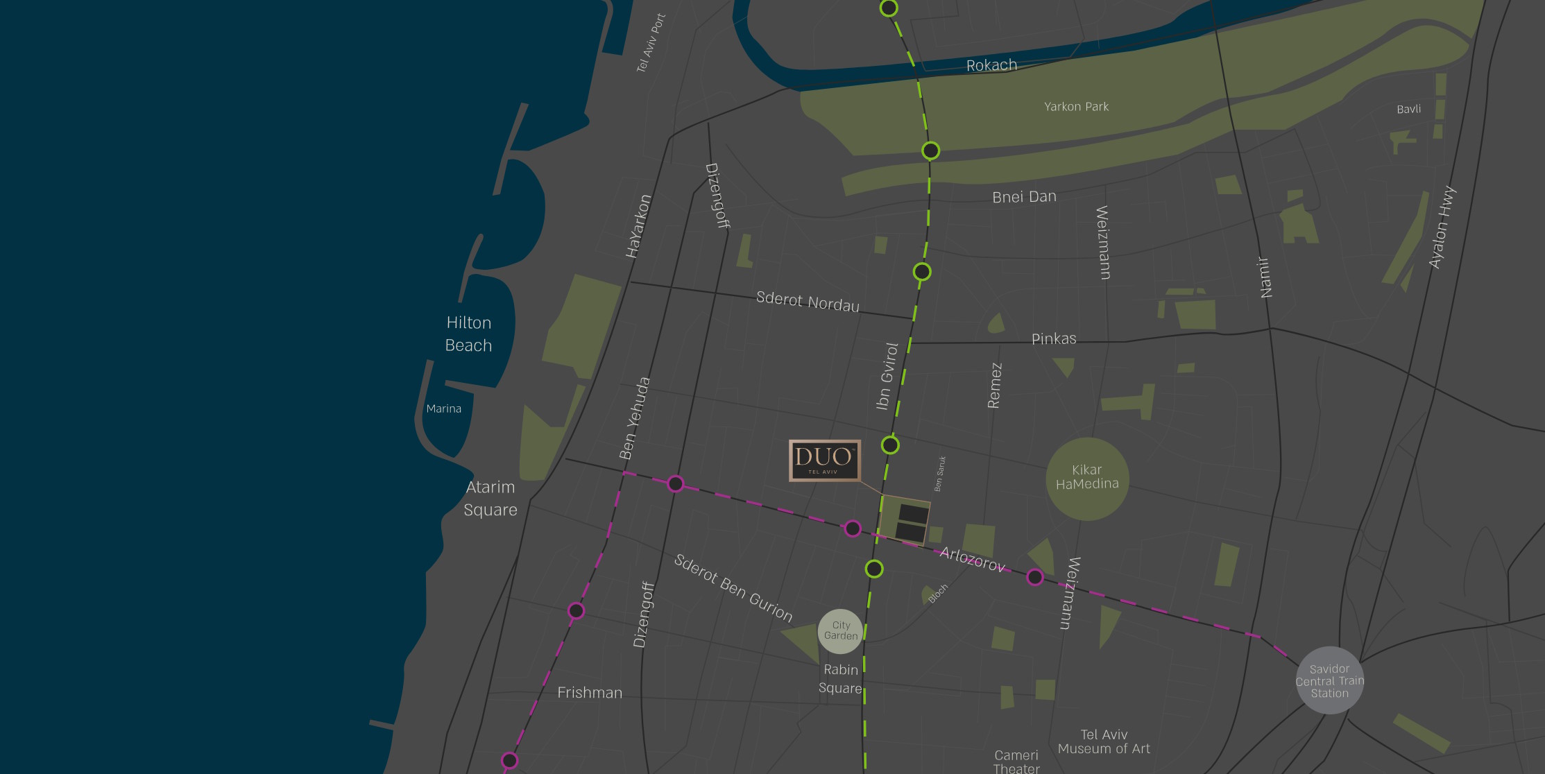 DUO® Tel Aviv is nestled at the very heart of the metropolis, in Tel Aviv’s most central and coveted location, and will blend harmoniously with the urban fabric of the city center neighborhoods, close to the Basel Complex, Milano Square, Kikar HaMedina, and the neighborhoods that border Yarkon Park.